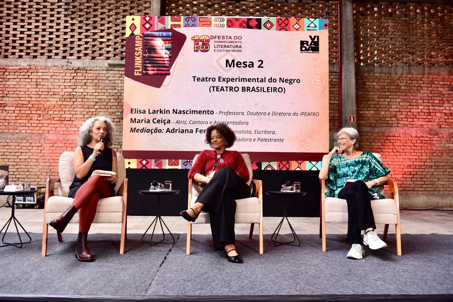 Sob a condução de Adriana, a conversa reuniu a atriz, cantora e apresentadora Maria Ceiça e a professora, doutora e diretora do Ipeafro Elisa Larkin Nascimento. Maria, força que conecta o moderno e contemporâneo, contou que não tinha ouvido falar do Teatro Experimental do Negro (TEN) durante a sua formação na década de 1990. O TEN foi fundado em 1944 no Rio de Janeiro pelo multiartista Abdias do Nascimento mirando a valorização social do negro e da cultura afro-brasileira por meio da educação e arte.