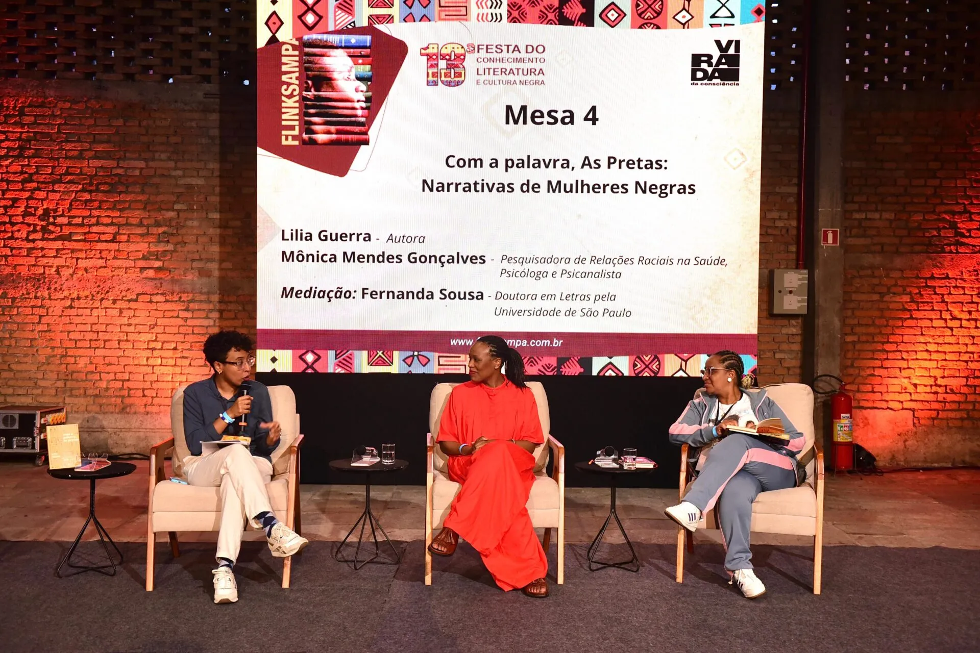 Com uma edição histórica e essencialmente dedicada às mulheres, a 13ª FlinkSampa – Festa do Conhecimento, Literatura e Cultura Negra terminou neste domingo (16), no Sesc Pompéia, em São Paulo, com o painel intitulado “Com a palavra, As Pretas: Narrativas de Mulheres Negras”. Mediado por Fernanda Sousa, o encontro reuniu a escritora Lilia Guerra e da pesquisadora de relações raciais na saúde, psicóloga e psicanalista Mônica Mendes.