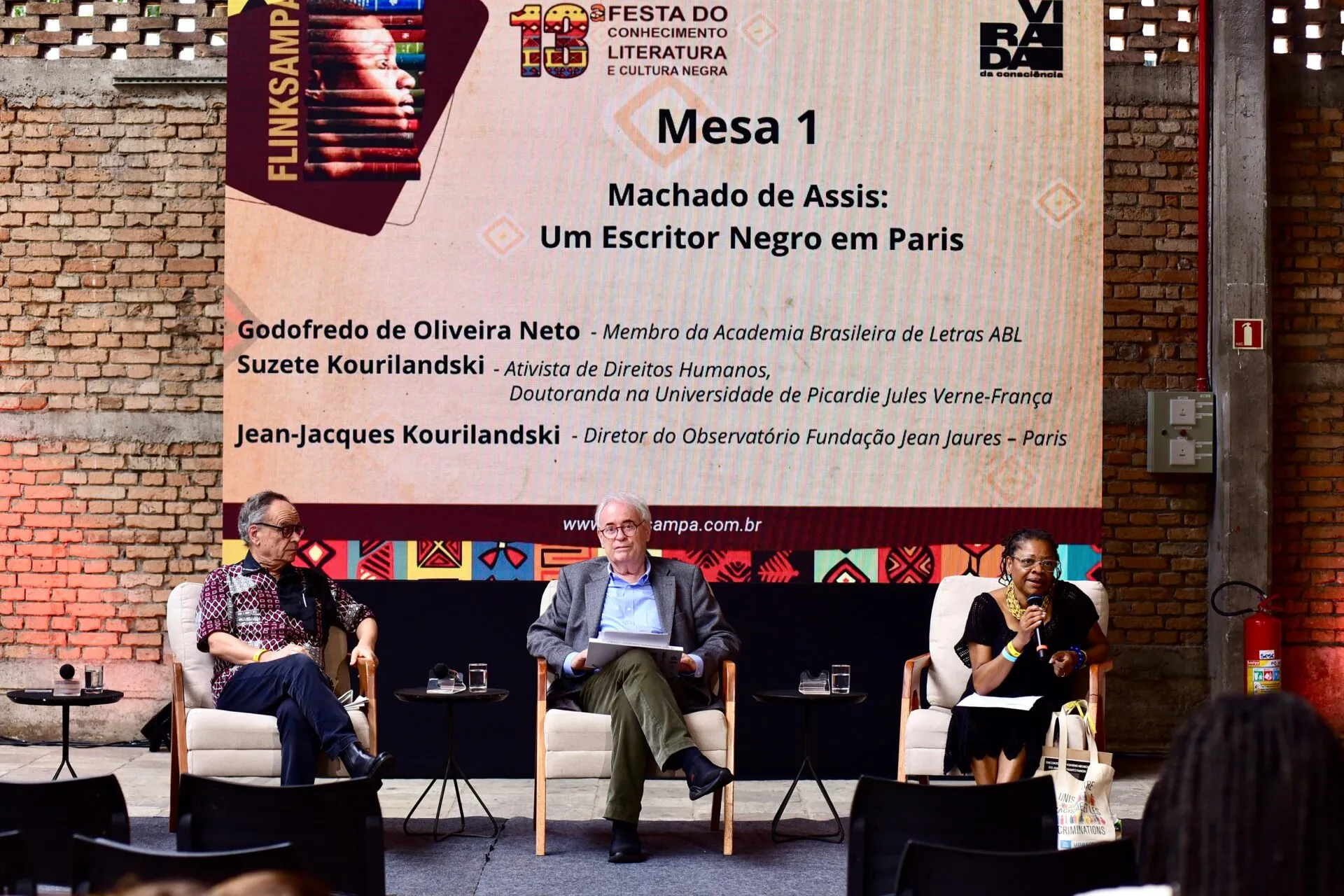 Neste segundo e último dia da 13ª FlinkSampa – Festa do Conhecimento, Literatura e Cultura Negra, realizada no Sesc Pompéia, em São Paulo, o público teve a oportunidade se aprofundar em Machado de Assis no painel Machado de Assis: um escritor negro em Paris, que reuniu o escritor e membro da Academia Brasileira de Letras, Godofredo de Oliveira Neto; a ativista brasileira de direitos humanos e doutoranda na Universidade de Picardie Jules Verne, Suzete Kourilandski; e o diretor do Observatório Fundação Jean Jaures – Paris, Jean-Jacques Kourilandski.